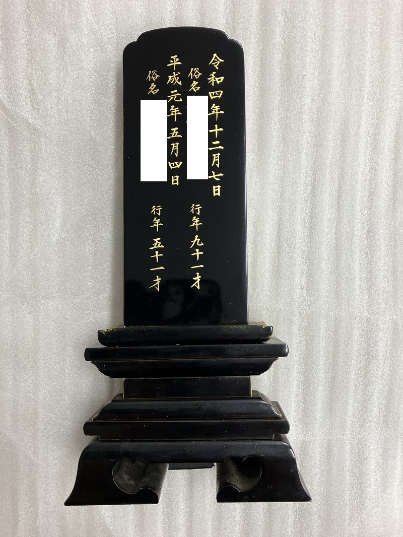 位牌の裏には没年月日 俗名(生前の名前) 亡くなられた歳が書かれています。 これで塗り直し作業と戒名書きが完成です。