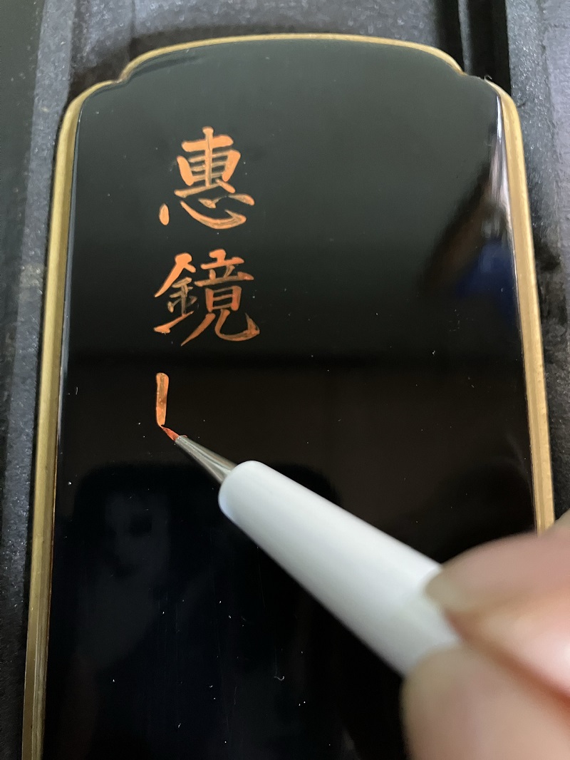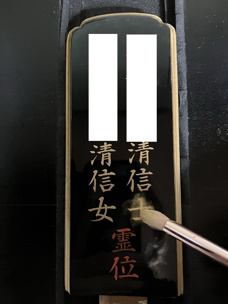 位牌の戒名書きの作業に取り掛かります。 まずはカシュ-塗料(朱赤)にて一字一字丁寧に 書きあげていきます。 (※戒名の一部を画像処理してあります)