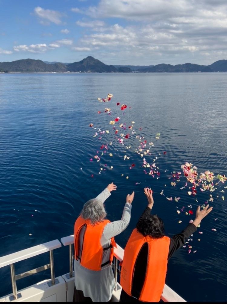 次に故人様に贈る美しい花びらを海へと撒華します。