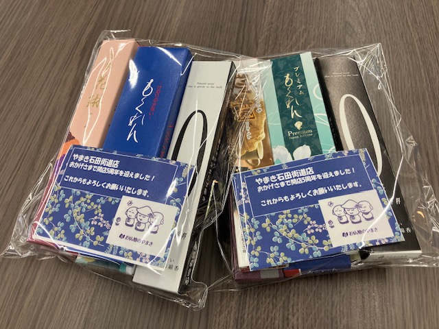 お盆用品以外にもお買上げをいただいたお客様へ…ささやかではございますがお線香&ミニミニろうそくのサンプル詰合せをお渡ししています。