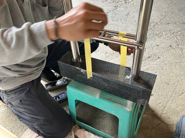 塔婆立台石の穴の中に接着剤を流し込みます。