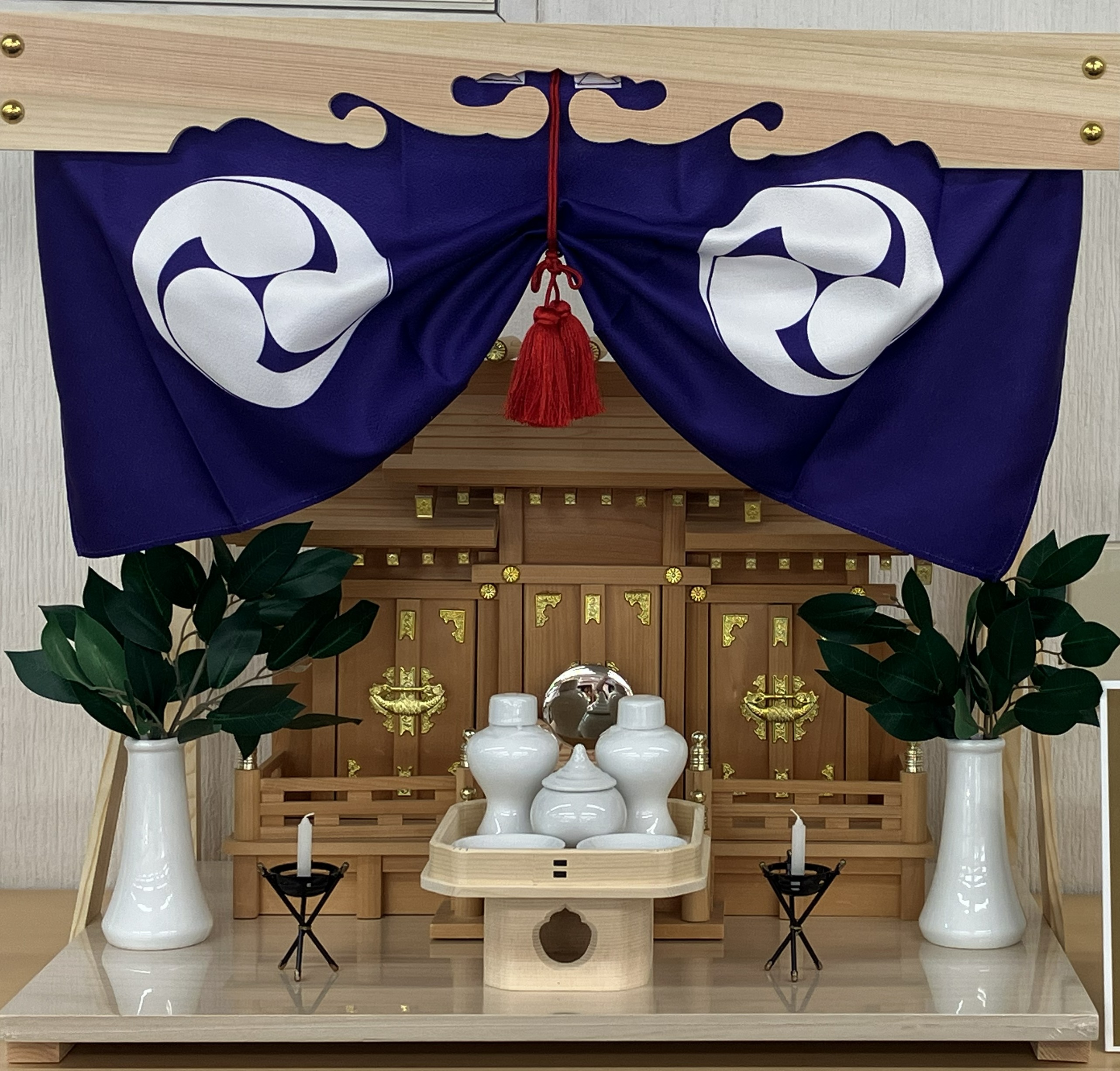 伝統的な神棚。神前幕やしめ縄は神聖な場所であることを示す為の神具です。