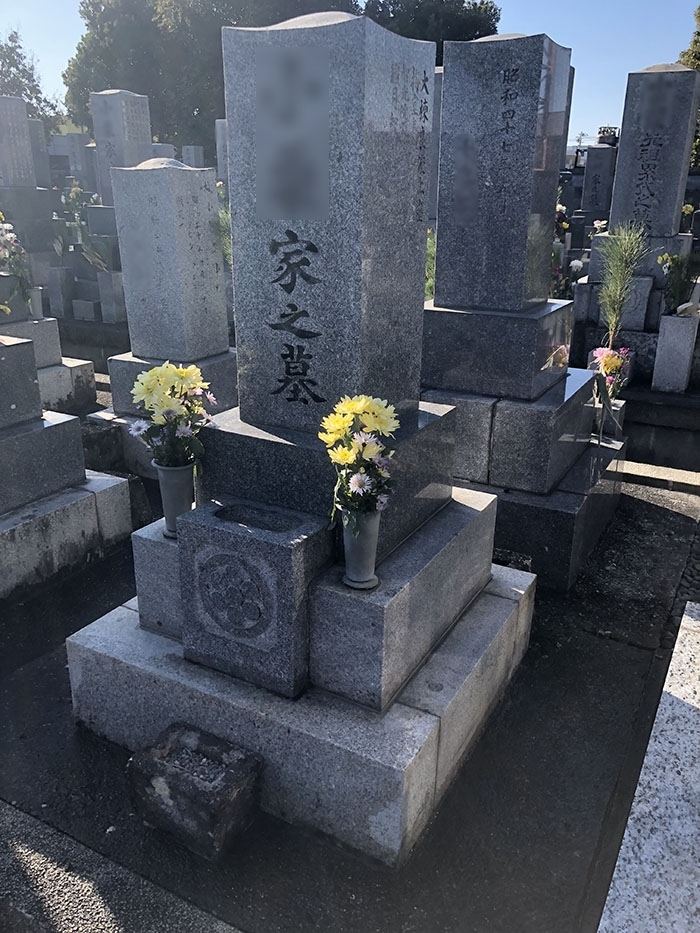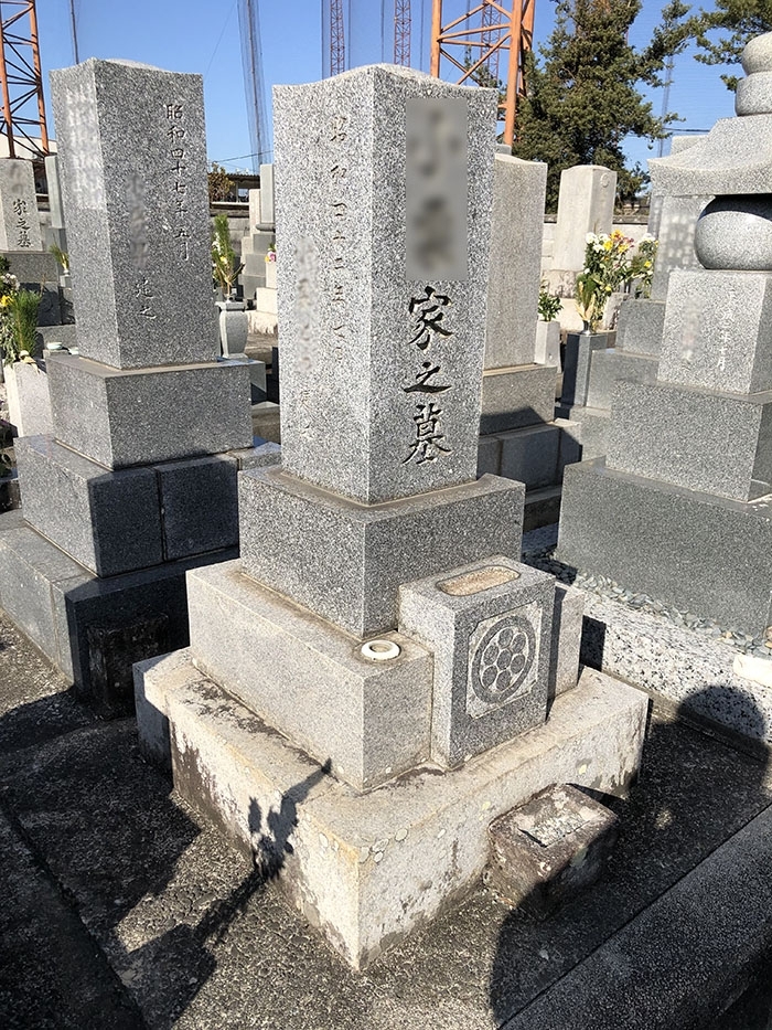 今回は墓石のクリーニングを行っていきます。 墓石のつなぎ目部分には水アカ、下台には白カビが 生えてしまっています。 (※戒名の一部を画像処理してあります)