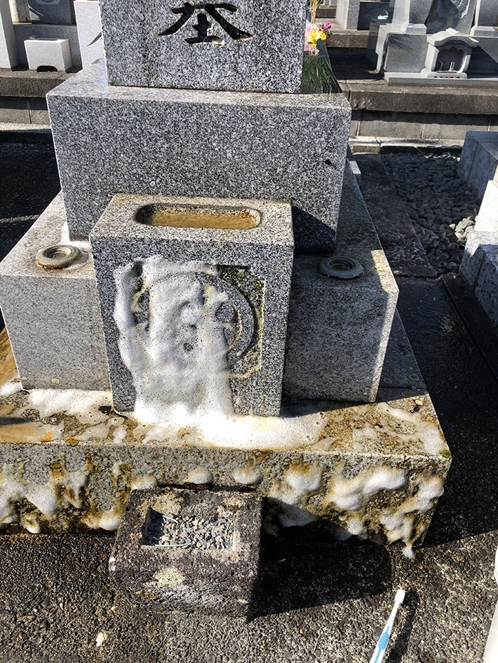 特殊洗剤を使った墓石のクリーニング。 長年付着していた水アカや白カビなどの汚れを綺麗にしていきます。