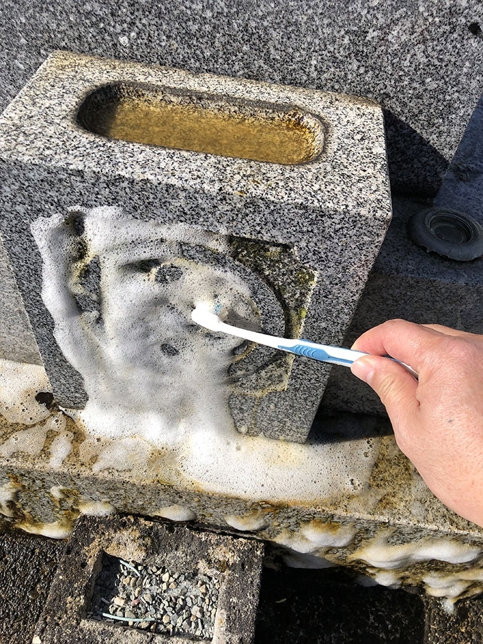 水鉢の部分に特殊な洗剤をかけて磨いている所です。 タワシでこすっても落ちなかった汚れが 特殊な洗剤を用いることで こんなに綺麗に汚れがとれていきます。 (ご自分で洗剤を使って掃除をしたい場合は、 必ず墓石専用の洗剤をお使いください。 市販の洗剤(塩素系などは特に)を直接墓石にかけてしまいますと 墓石にシミや変色ができてしまう可能性がありますのでご注意ください。)