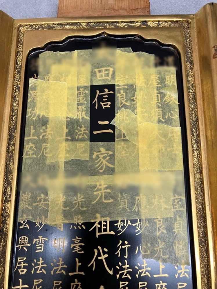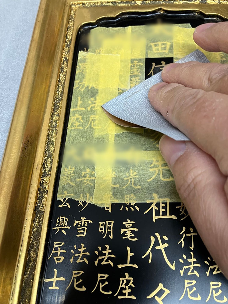 台座から戒名が書かれている札板を外し、書き直す箇所以外にマスキングテープを貼ります。 (※戒名の一部を画像処理してあります)