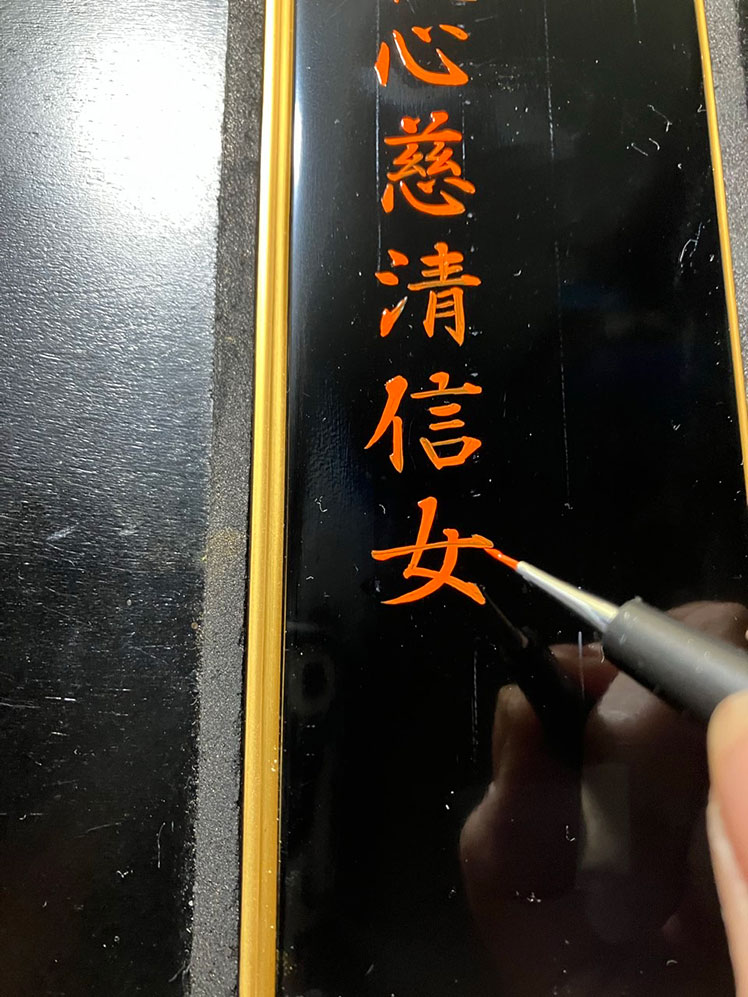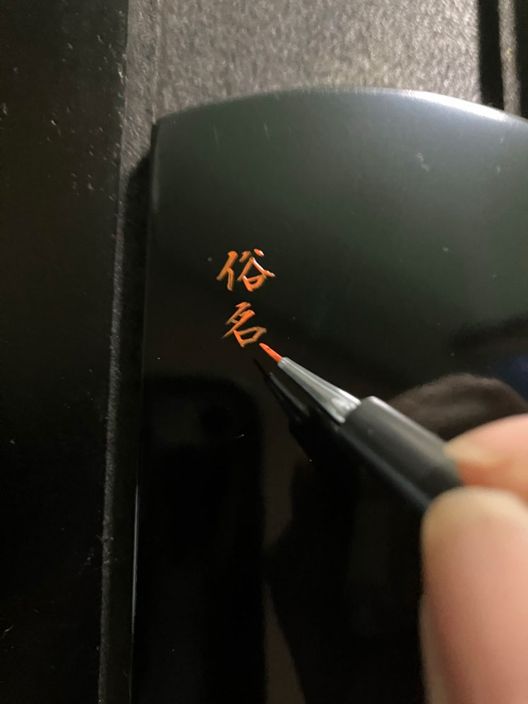 次に戒名書きの工程に入ります。 まずは裏面から、カシュー塗料朱色と極細筆で、 2名分の没年月日、俗名、没年齢を書いていきます。 汚れや傷をつけないように左側から書きます。 こちらの戒名書き師は、アタリ(字幅や行間、文字を書くための位置決め)の線を引かず、 フリーハンドで書いていきます。