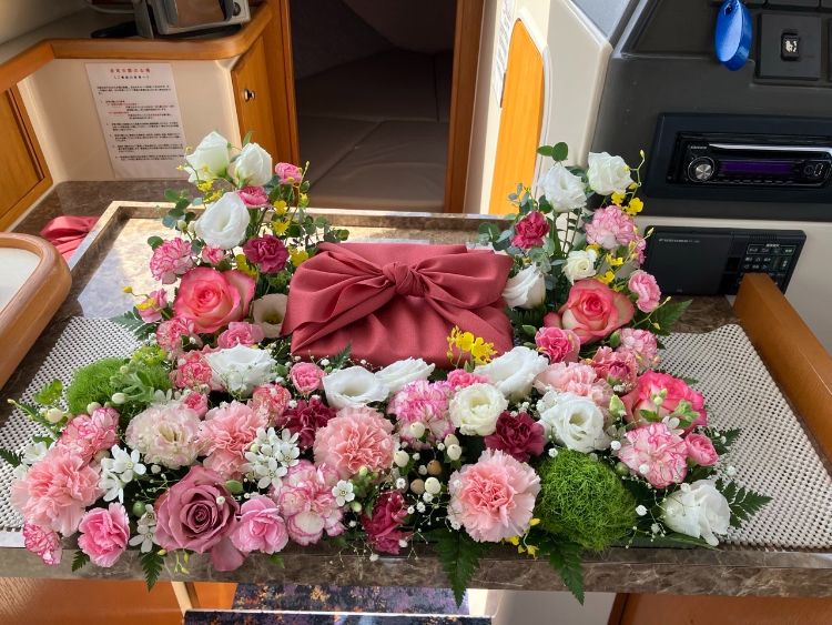 美しい花びらを海へと撒華します。 散骨証明書作成のため、同時にビデオ撮影も行っております。