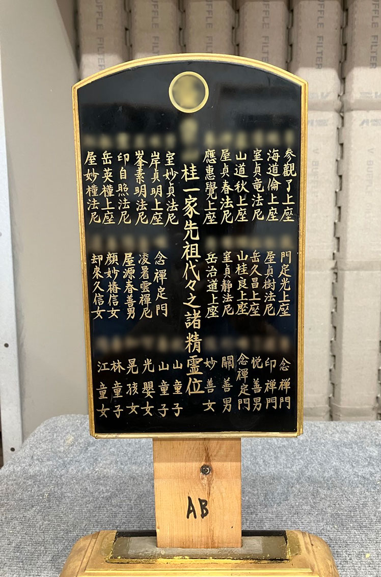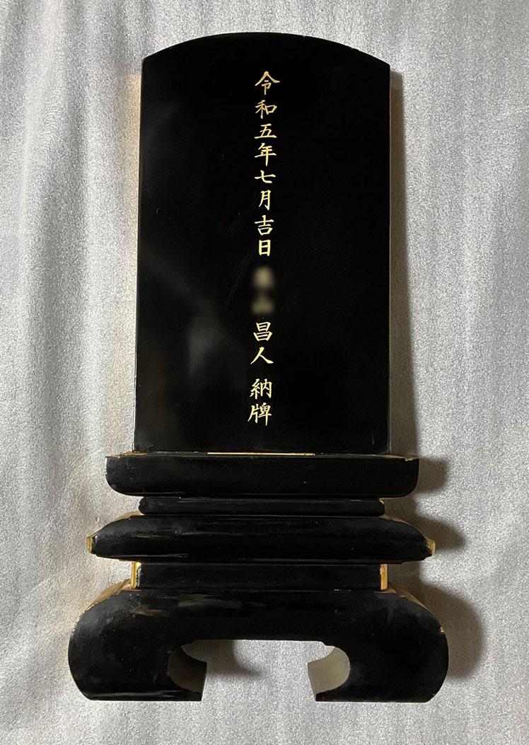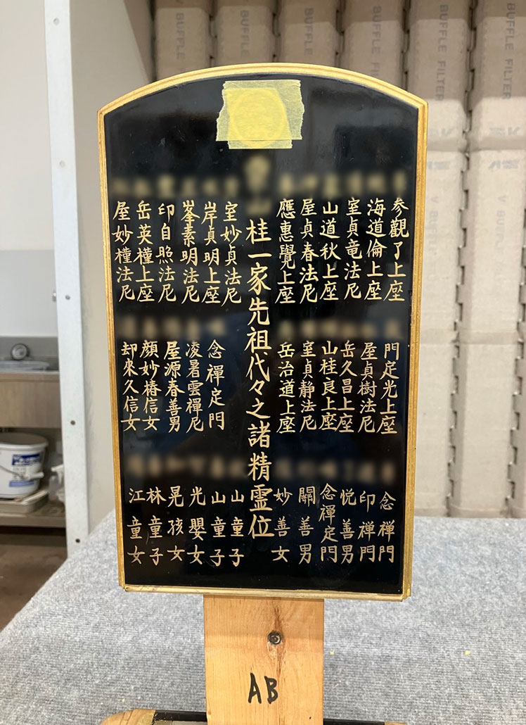 札板を台座から取り外してから作業します。 (※戒名の一部を画像処理してあります)