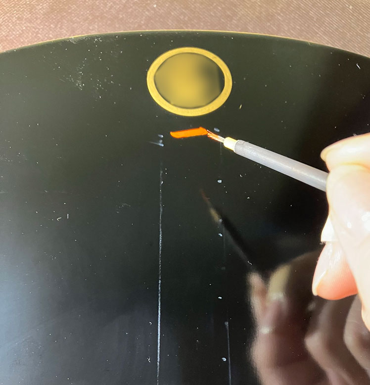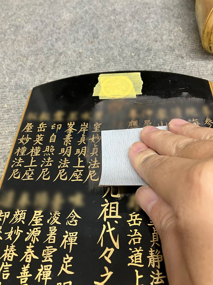 クリア塗装をし、乾燥させた後、表面を磨きます。 次に文字書入れの工程に入ります。