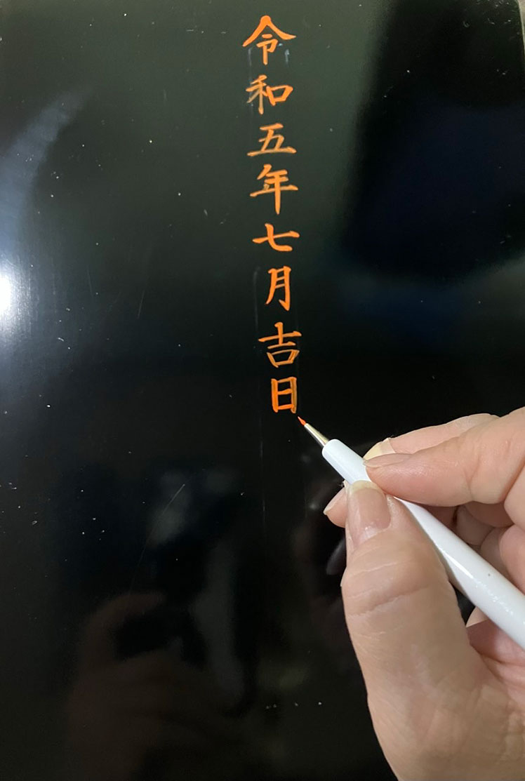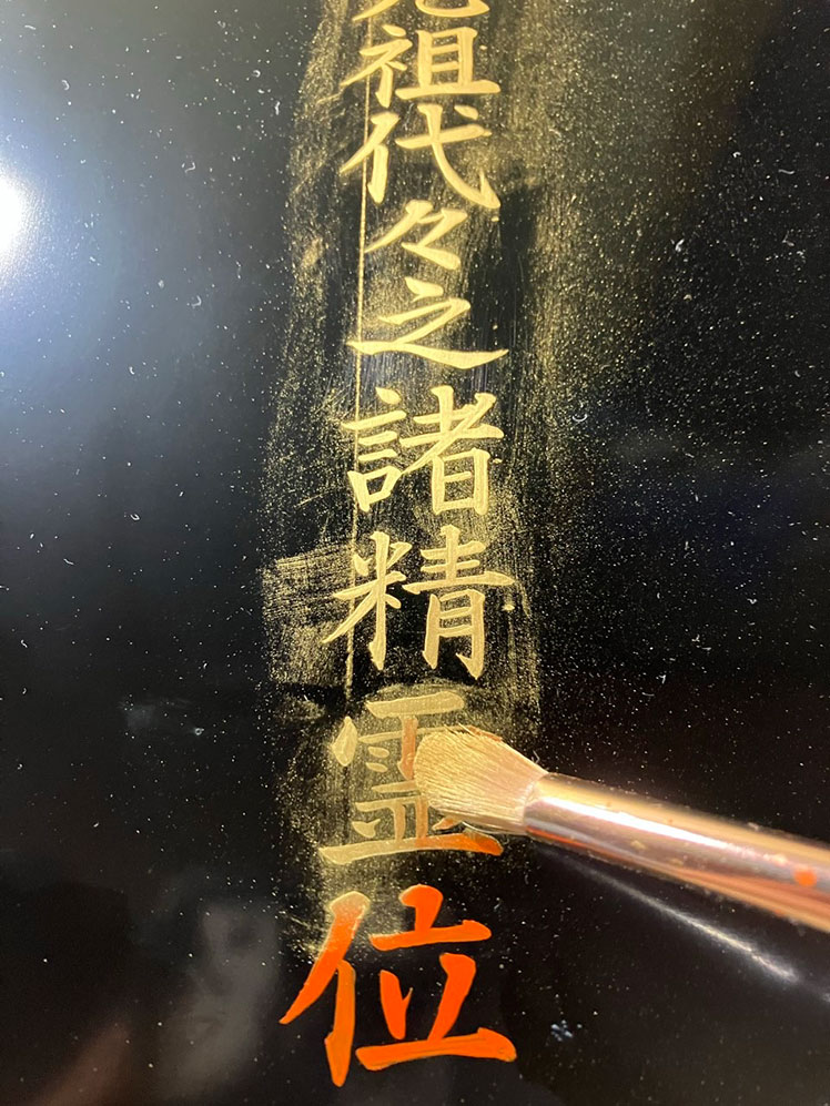 札板中央に「先祖代々之諸精霊位」の文字を字幅2㎝で書き上げます。 カシュー塗料朱赤と蒔絵筆をしようします。