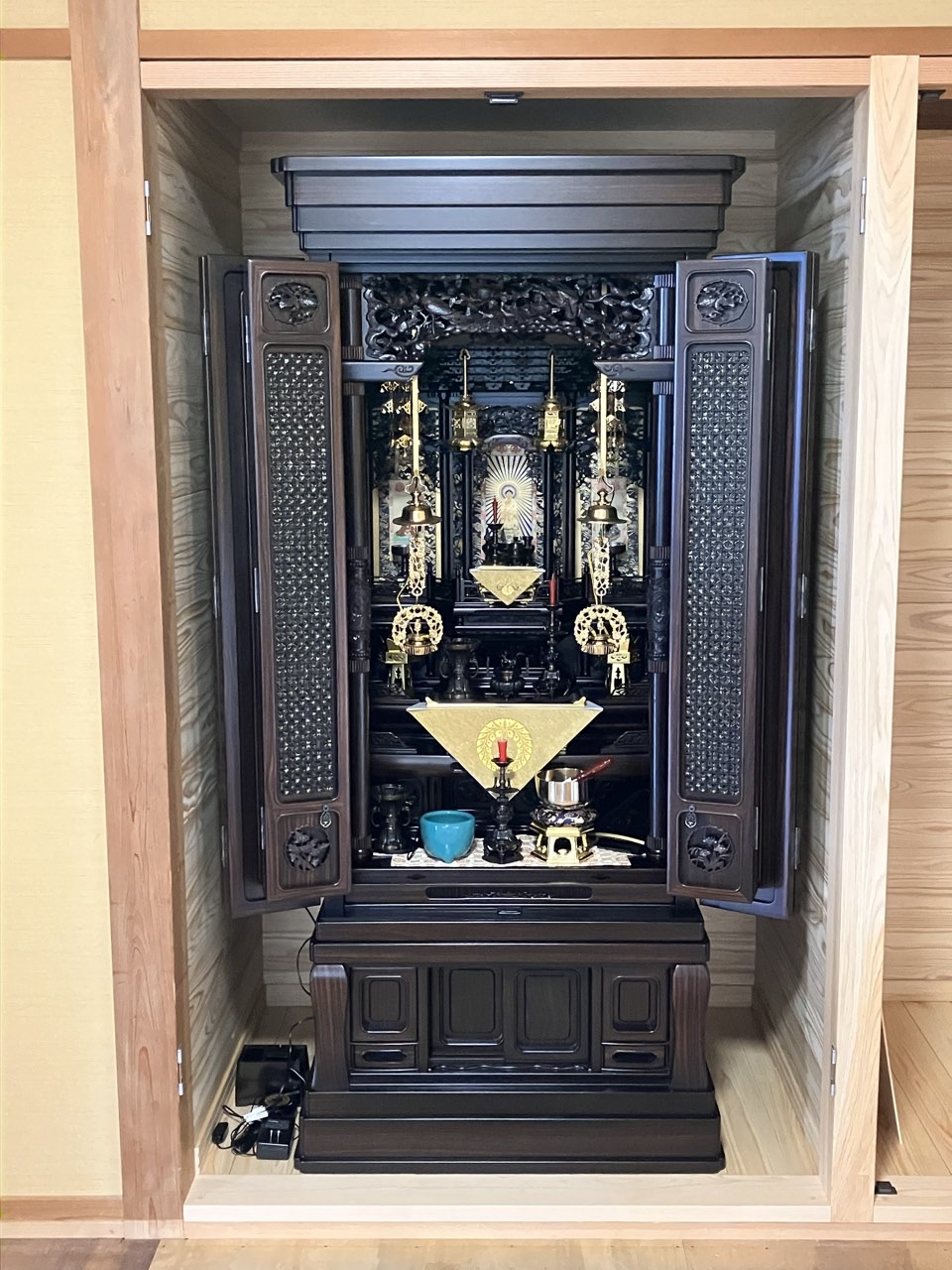 最近ではお寺様のご理解があれば、金仏壇より掃除、お手入れが楽な唐木仏壇に浄土真宗の仏具を飾り付けされるお客様もいらっしゃいます。