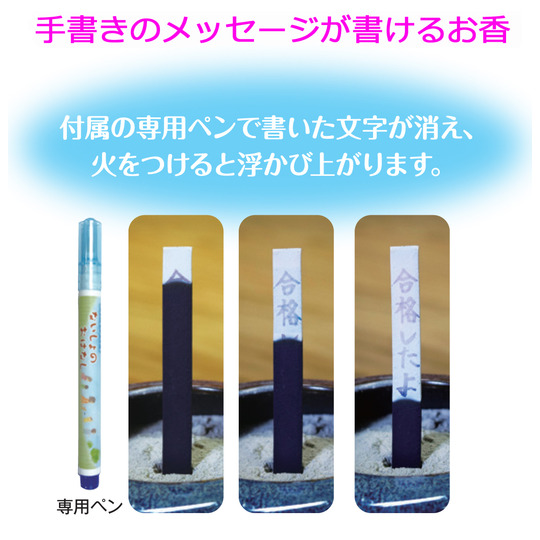 こちらは火をつけると灰がそのまま残って言葉が浮き出てくるという珍しいお線香です。