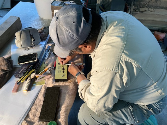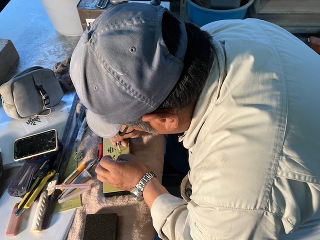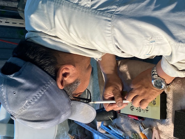 親方が手作業で字の細かな部分のゴムも取っていきます。