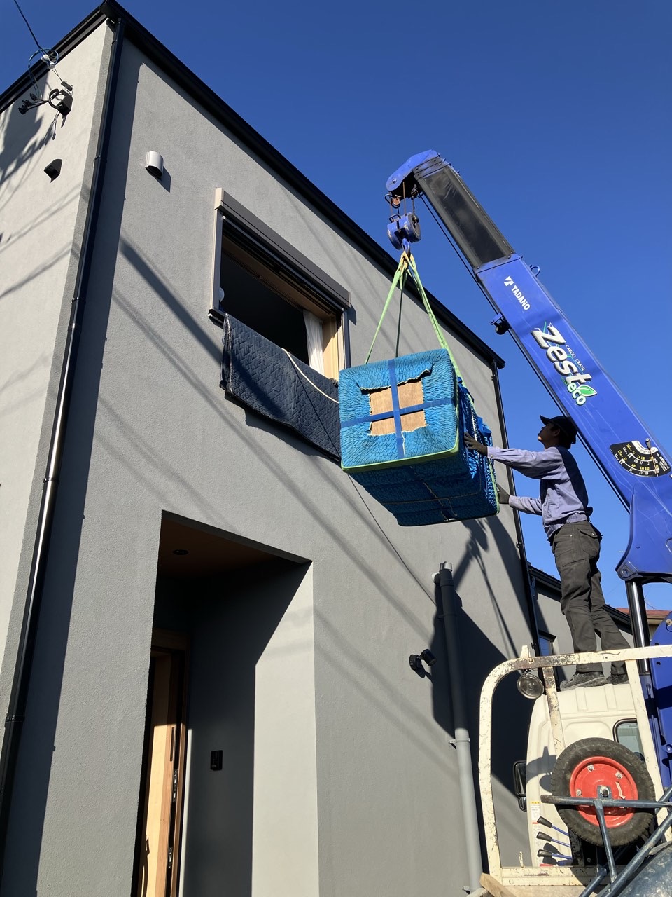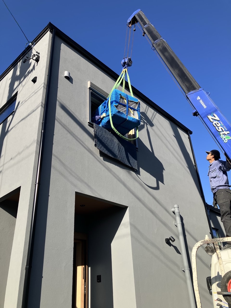 新築された家の2階の腰窓から、クレーン車を使用しての搬入です。