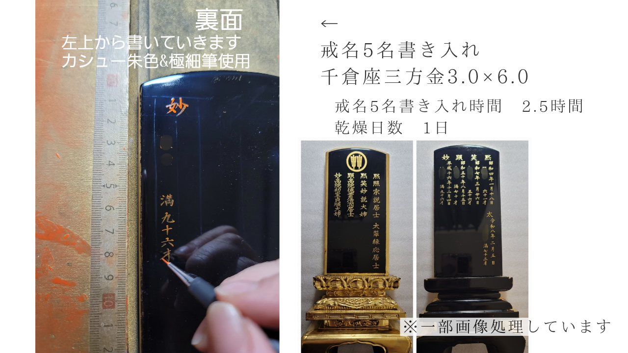 位牌の戒名手書きは、戒名書き師が筆と漆(代用としてカシュー塗料)を使って一文字一文字を手で書き入れする方法です。