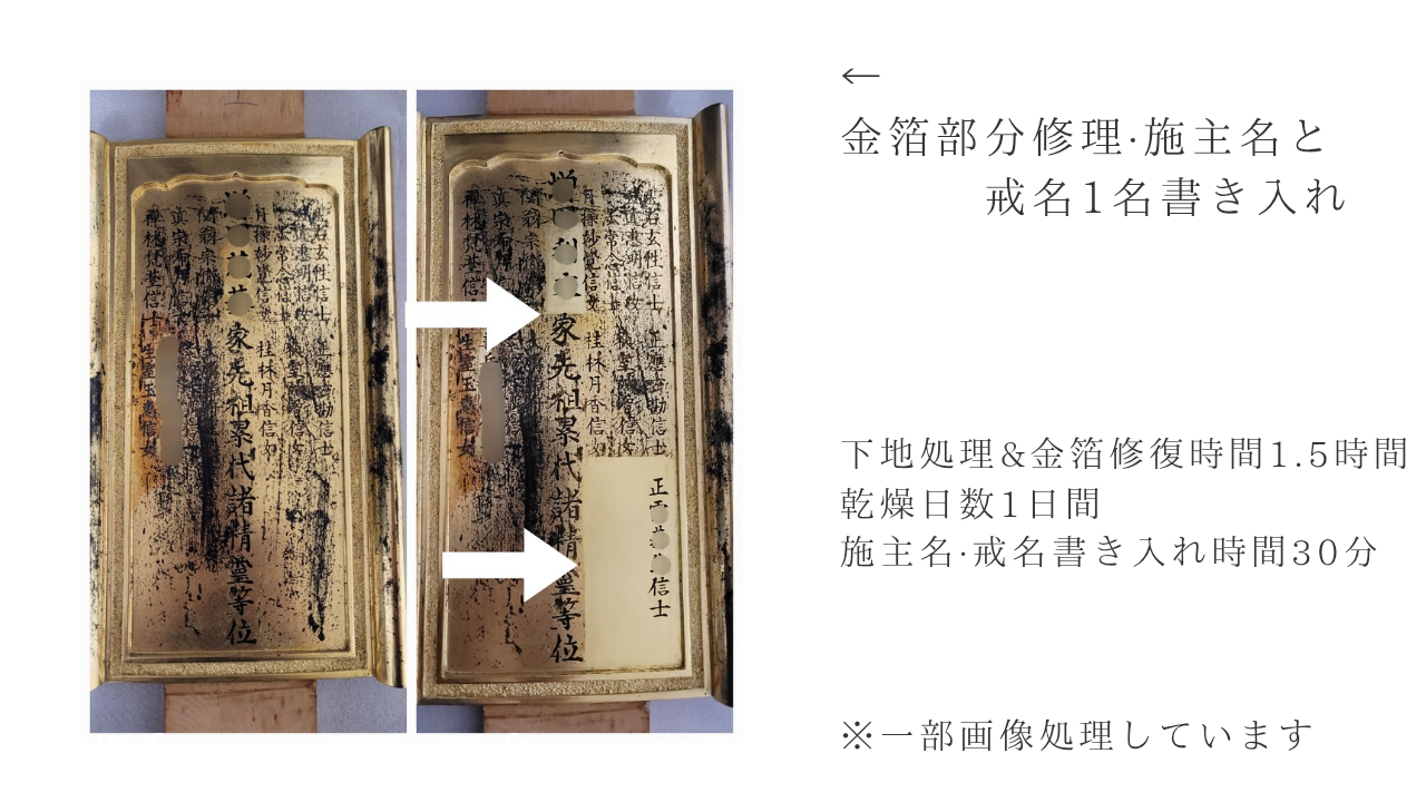 ⇑ 施主名変更と新たに1名戒名書き入れのため、金箔が剥がれて黒くなった2箇所を金箔貼りしました。