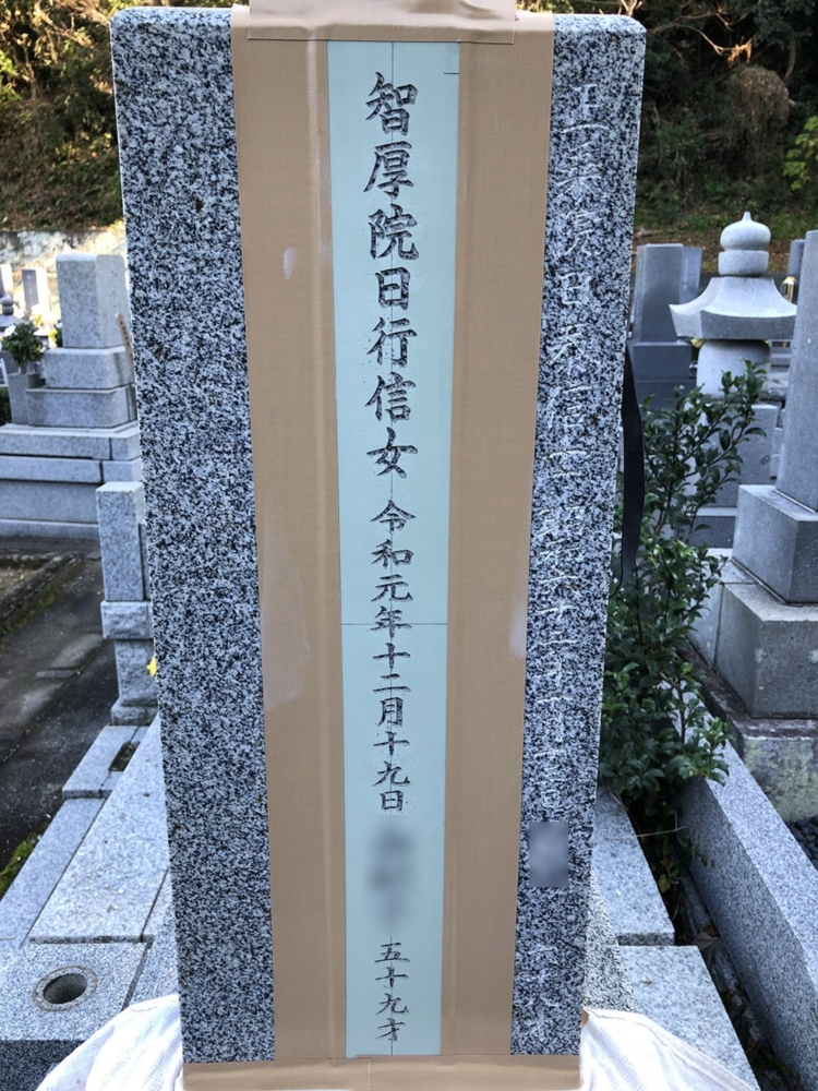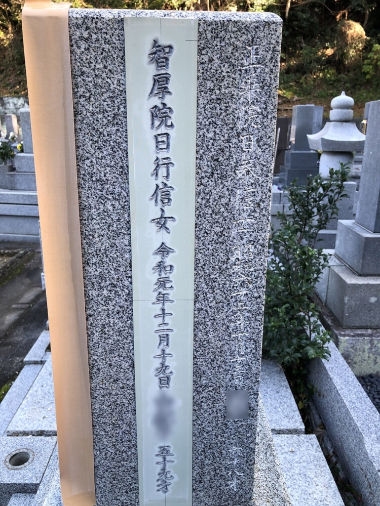 お墓の舞台部分の施工の様子です。 外柵部分の継ぎ目部分に ステンレス製の耐震L金具を取り付けたところです。 (※戒名の一部を画像処理してあります)
