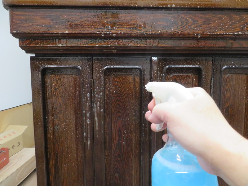 それでは仏壇全体のクリーニング作業に取り掛かります。 特殊な洗剤を吹き付けて綺麗なタオルで拭きとっていきます。