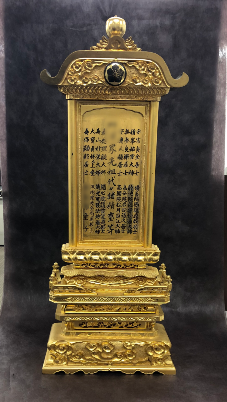 札板のみの塗り直し(裏を黒)と金箔リフォームのご依頼をいただきました。6.0巾×10.0寸の立派なお寺位牌です。 (※戒名の一部を画像処理してあります)