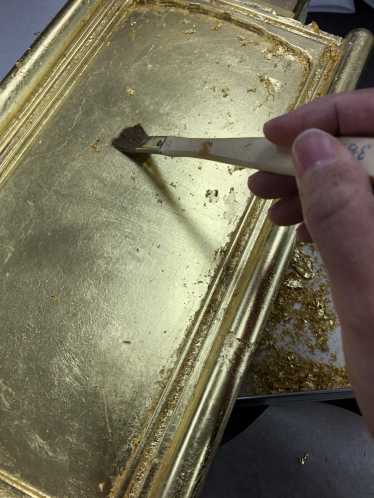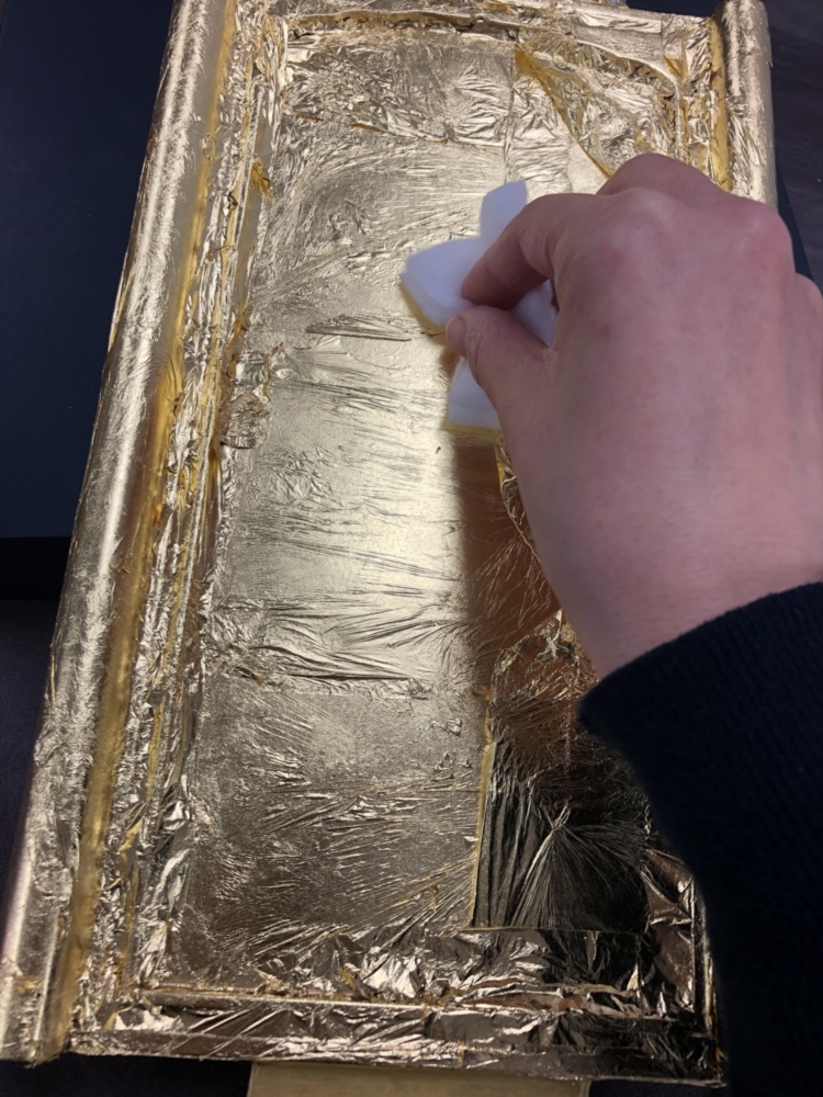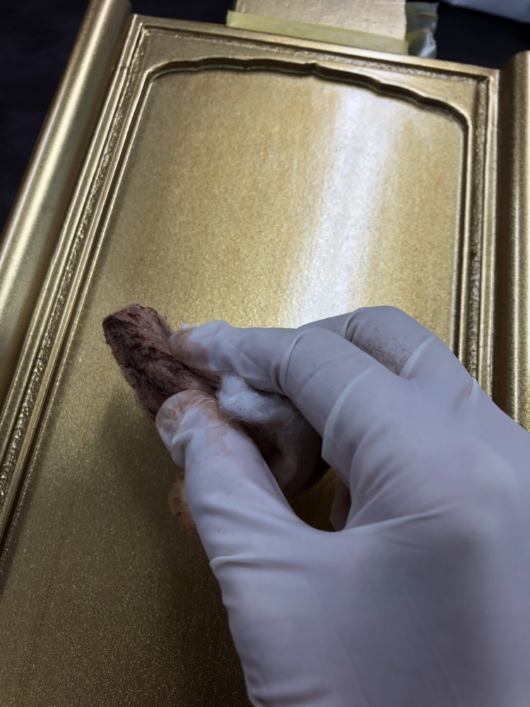 金箔を押す部分に、金箔用の接着剤を塗っていき、拭きあげます。