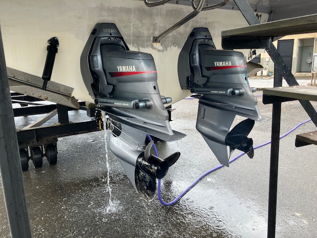 ドライブユニットの冷却水取り入れ口に水洗ユニットを付け水道水で海水を洗い流しています。