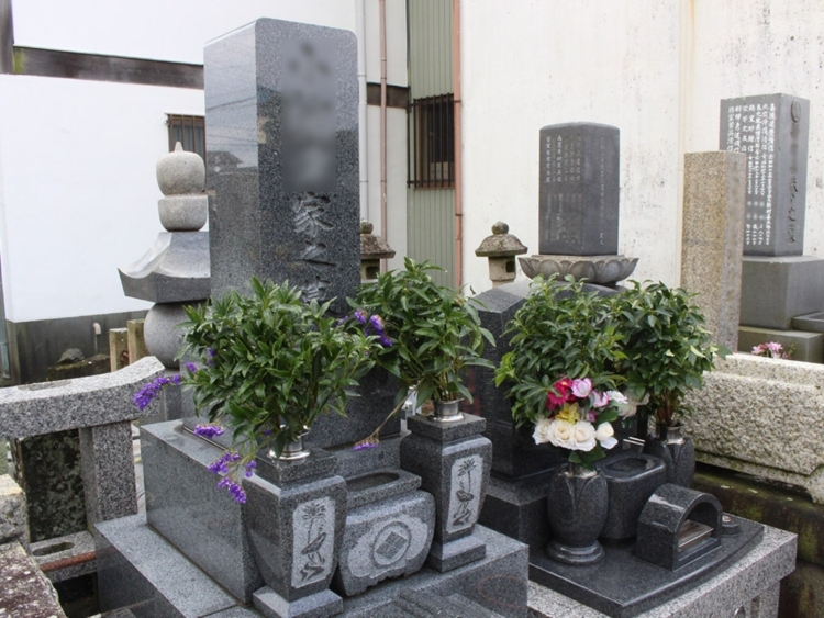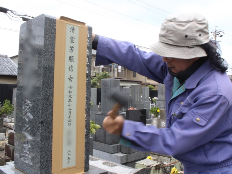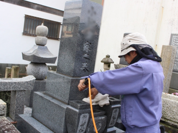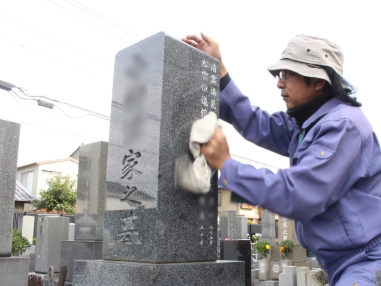 昨日の雨で墓石が濡れていました。 このままでは作業ができないので、まずは 墓石を拭く作業から始めます。 (※戒名の一部を画像処理してあります)