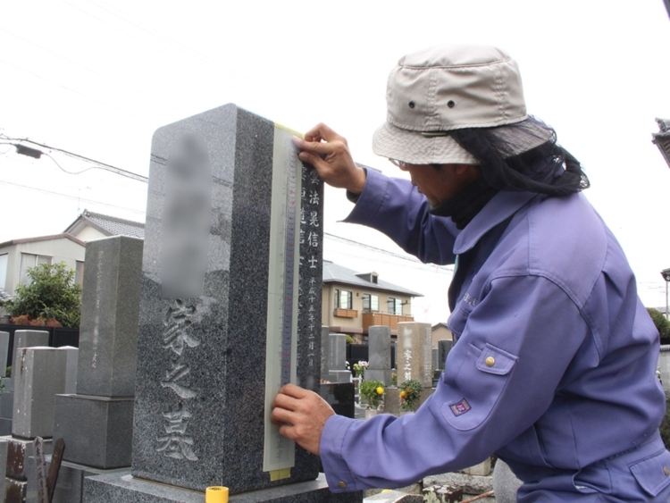 既に書かれている戒名と高さを合わせるため 上下の高さを測りながら慎重に ゴム板を貼りつけていきます。