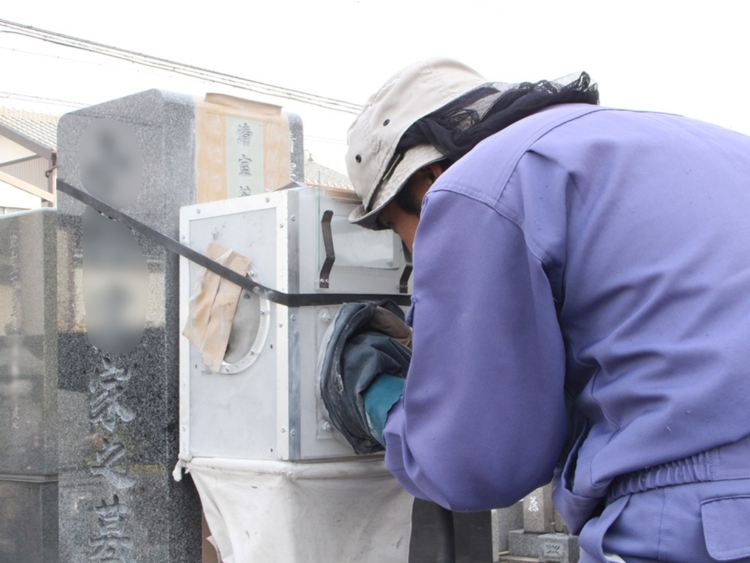 サンドブラストを使って文字を彫っていきます。 削られてほしくない箇所はゴム板で 保護されているので、戒名の文字の部分だけが 綺麗に彫り込まれていきます。