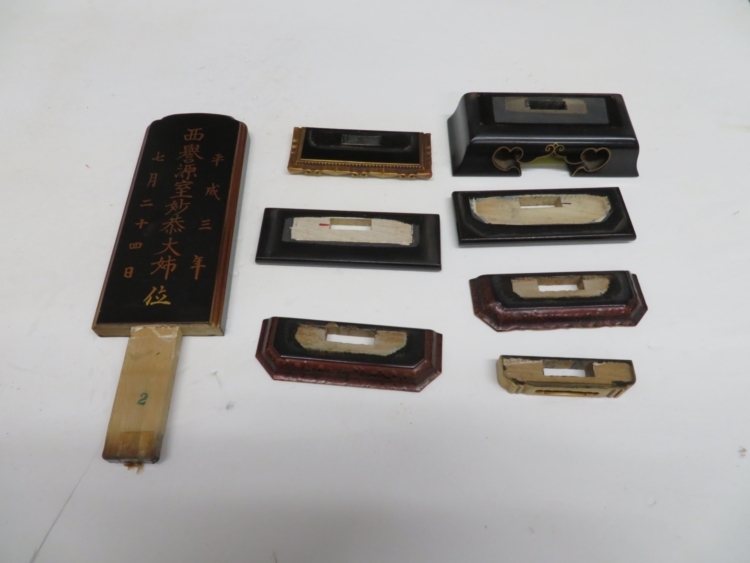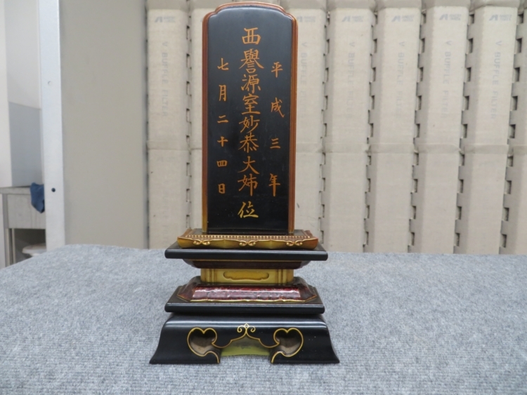 今回は位牌のクリーニングをさせて頂きます。 お線香の煙や蝋燭のススやホコリなどの汚れがついてしまっています。 (※戒名の一部を画像処理してあります)