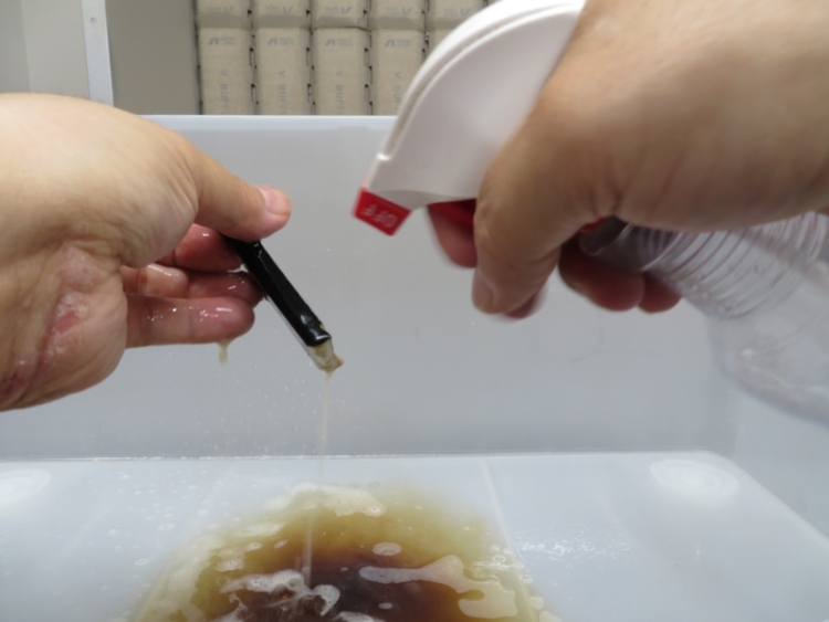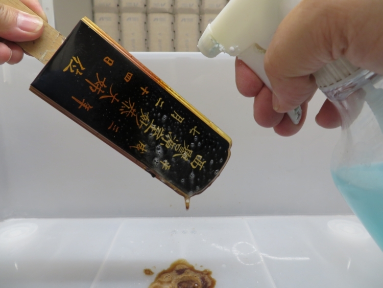 札板を特殊洗剤で洗浄します。 だいぶ汚れの差が出ています。