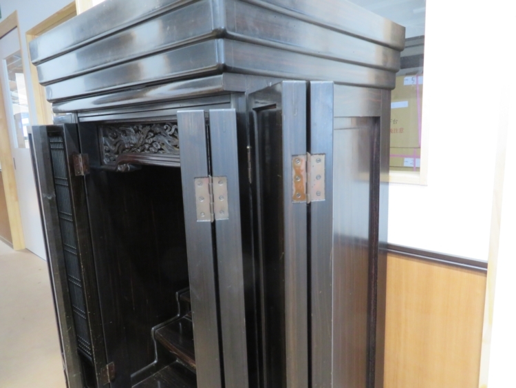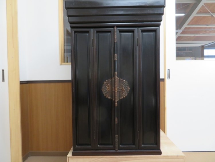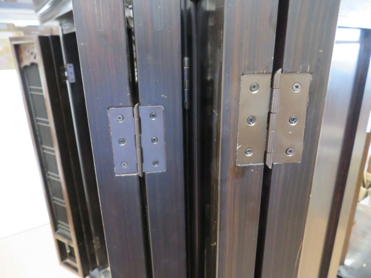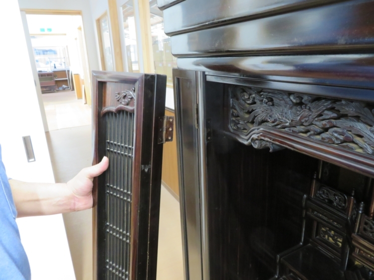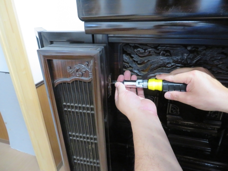 扉に蝶番を取付けしたところで 次は仏壇本体に工具を使い丁寧に扉を取付けていきます。