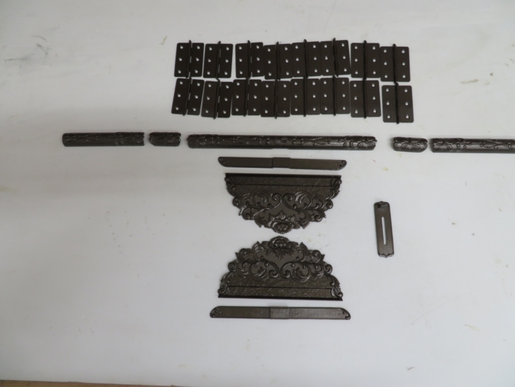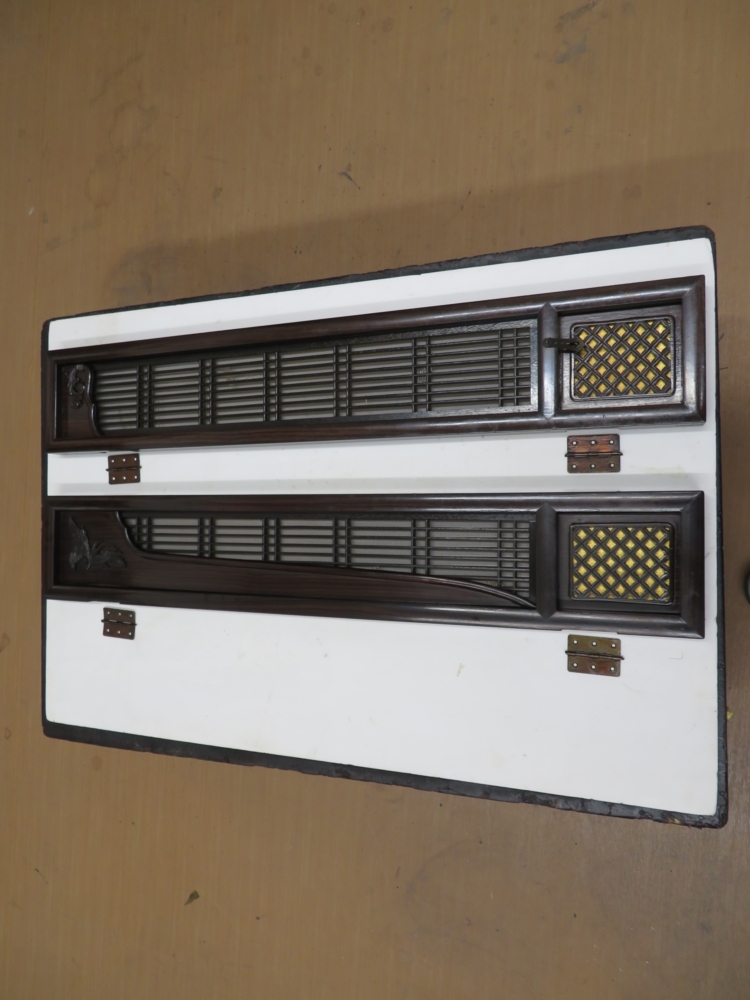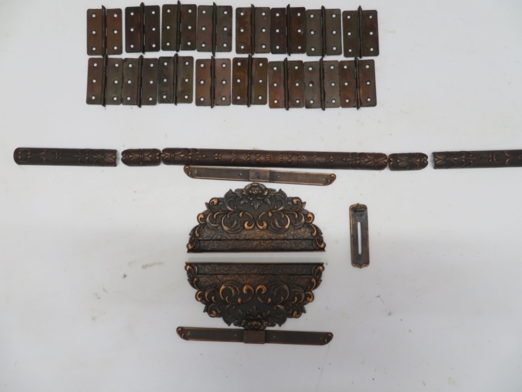お仏壇の金具のメッキ塗装のご依頼を受けました。 長い年月で色艶がなくなってきているのが分かります。 扉についている大きな金具を八双(はっそう)と言います。