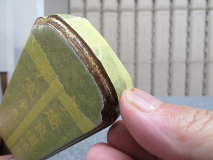 長い年月で金粉が剥がれてしまっているのがよく 分かります。 金色部分を残してマスキングテープで養生していきます。