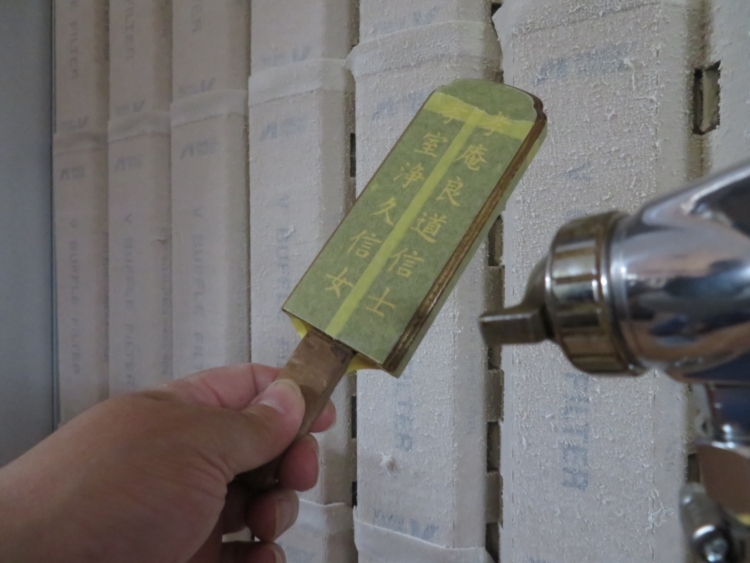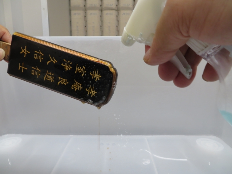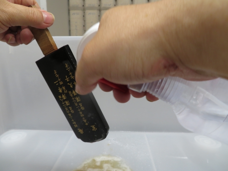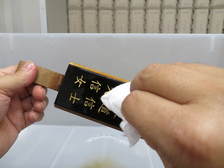 位牌洗浄後 柔らかい布でこすらないように 札板を拭き取ります。