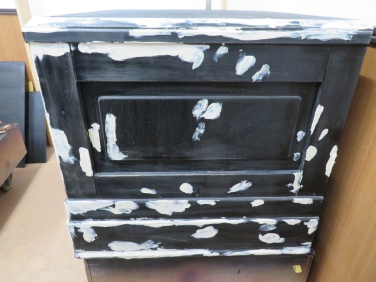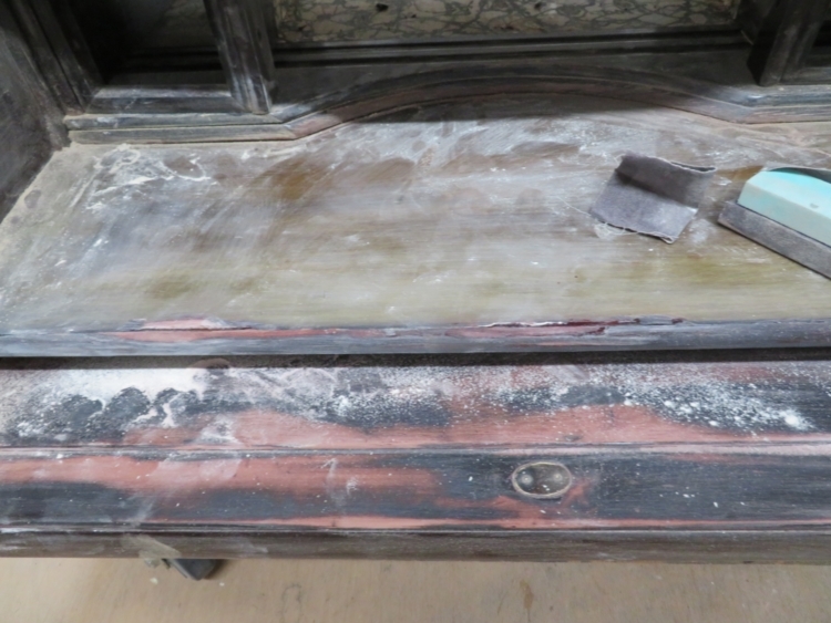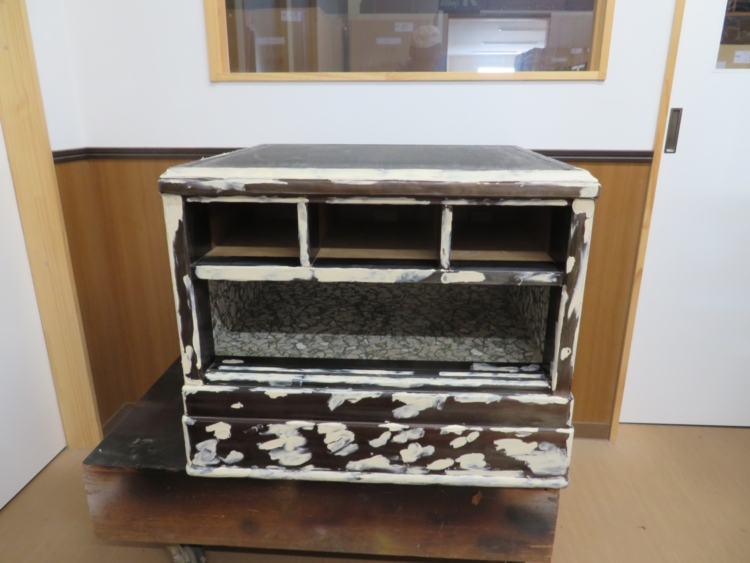 小さな引き出し部分の金紙を取り外したところです。 今回はリフォームを始める前の準備となります。 次回から本格的な修理になります。