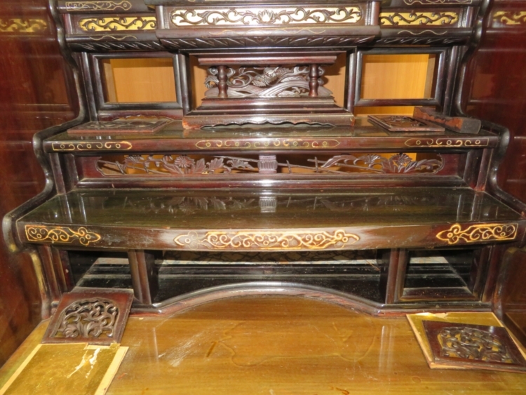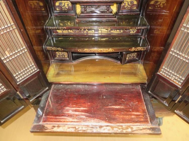 仏具等をのせる膳引きと仏壇の中です。 だいぶ傷やシミ汚れが目立ちます。