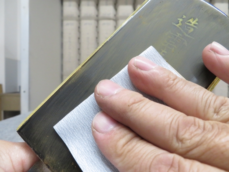 ペーパーで戒名を消した後 艶を出す為 専用の器具を使用し塗装を施します。