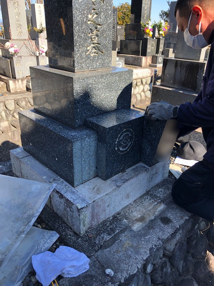 納骨室を開けるため周りの水鉢や花立を移動します。