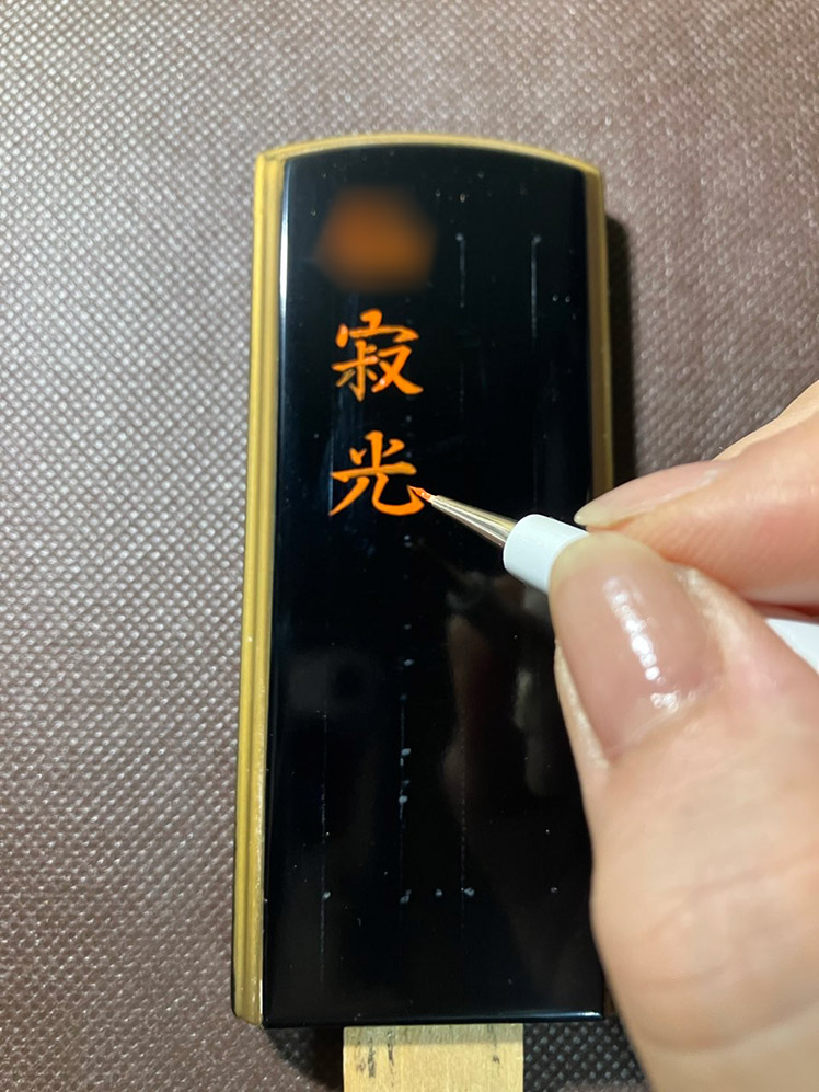 表面、左側から戒名文字の書き入れを行います。 カシュー塗料朱赤と極細筆を使用します。