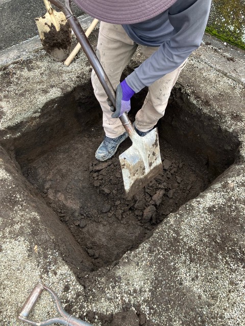 カロートの位置を出したら、床掘り(とこぼり)をします。
