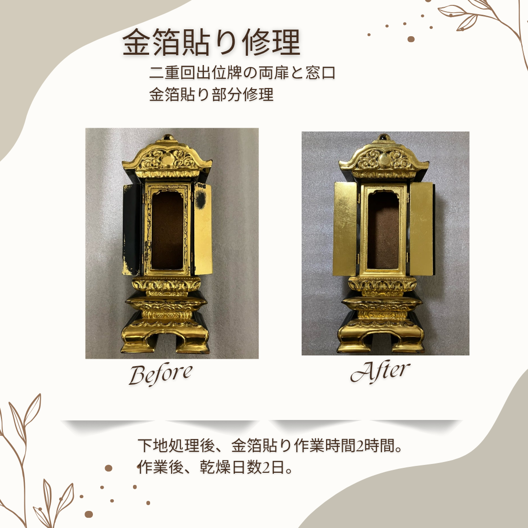 今回は、金箔貼り全リフォーム、回出位牌の両扉部分修復、施主名の箇所部分修復、文字入れをご紹介します。