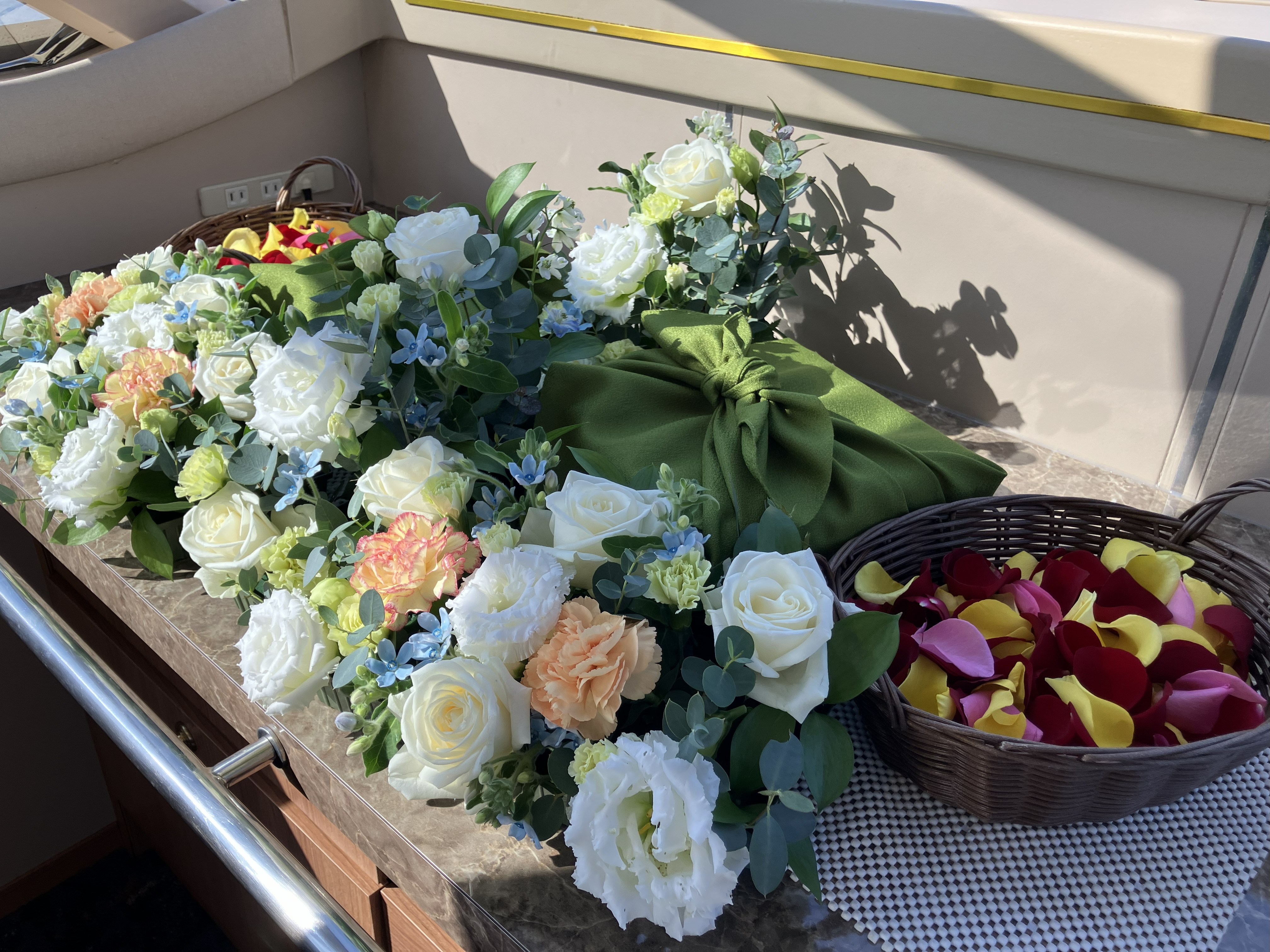 この日は、2組のお客様にご参加いただき、実際のセレモニーのように船内にお花を飾り、