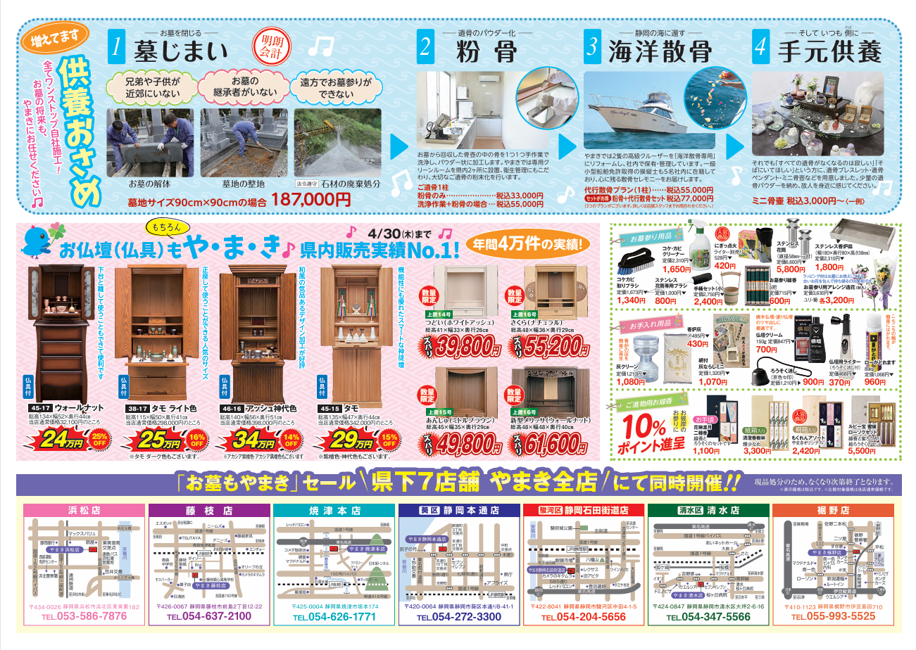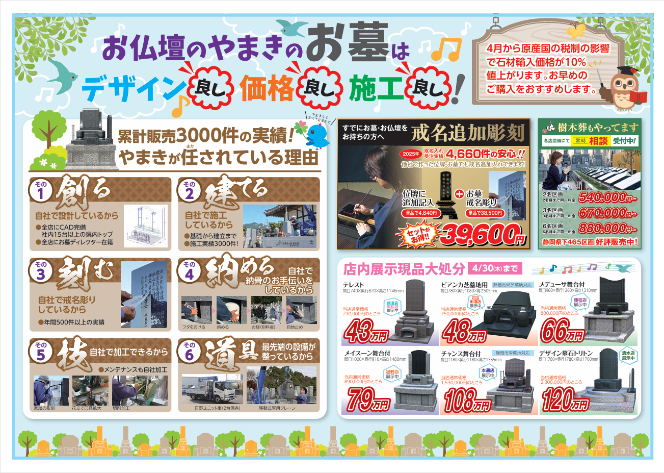 やまきでは、4月末まで「お墓もやまきセール」を開催し、情勢に抗い少しでもお安くお墓をお求めいただけるよう、各店で展示墓石の大特価セールを行っています。