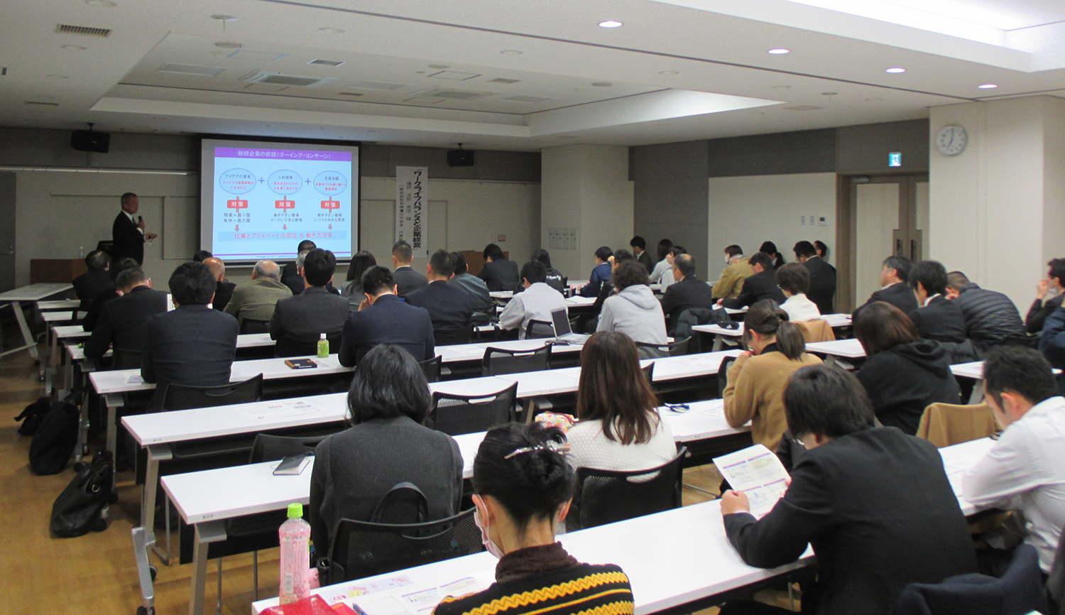 浅野社長は最近の物流業界や保育業界で進む人材不足の現状や、今年生まれた人の平均寿命〈余命〉は105歳~110歳になるなど、80歳まで働ける職場環境を整備すべきことを念頭に挙げ、企業はどのようにして働き方改革(休暇の取得促進)を行うべきか、やまきの導入事例を随所に出しながら説明をしていきました。