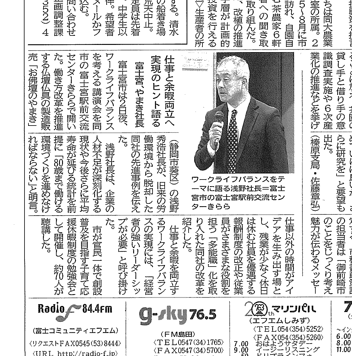 富士宮市が普及を目指す子育て応援休暇制度の第2回目の勉強会で、やまき浅野社長が「ワークライフバランスと企業経営」のテーマで講演を行った様子が、静岡新聞に掲載されました。