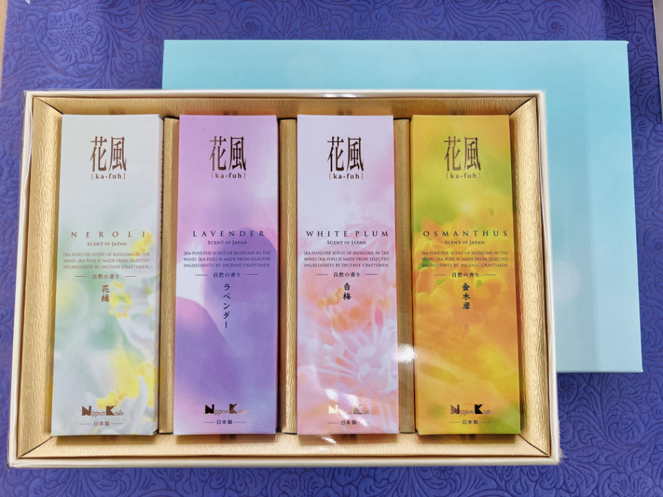 花橘・ラベンダー・白梅・金木犀の4種のお花の香りを合わせた贈答用お線香です。