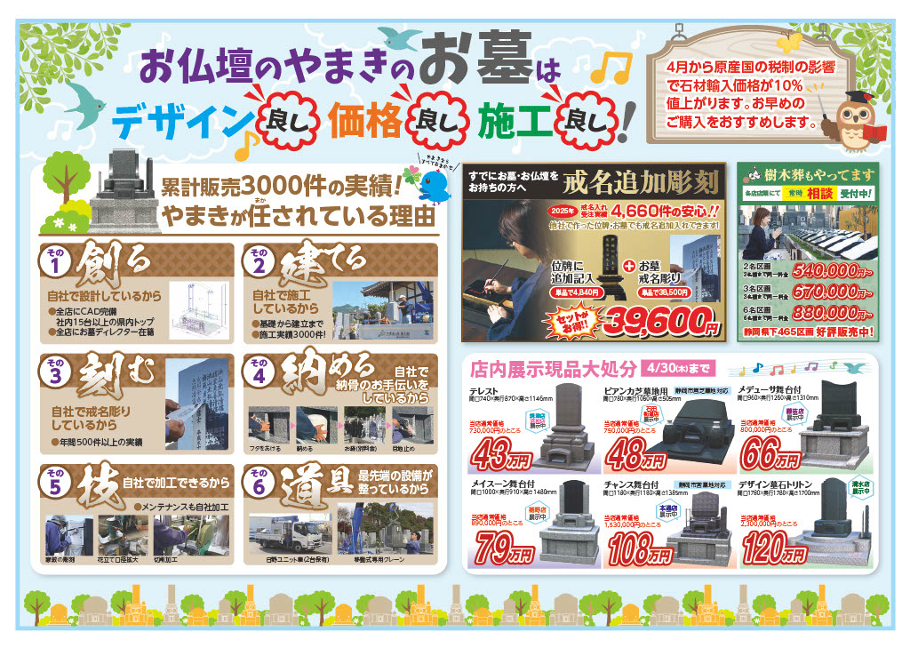 お仏壇のやまきでは3月14日から4月30日まで「お墓もやまき」セールを開催中です。